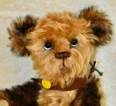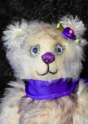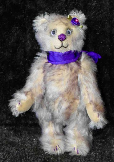 Violet 6 1/2" tall cream mohair tipped in lavender. A dainty little bear with glass eyes and a purple stitched nose. She has a pretty purple ribbon and gold suede paw pads. USD $195.00