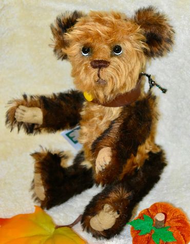 Patty is a lucky Leprechaun bear, 13" lavender and green curly mohair, dark green velvet paw and footpads, green glass eyes, handstitched nose and mouth, wearing a Leprechaun hat and a green bow tie. $200.00