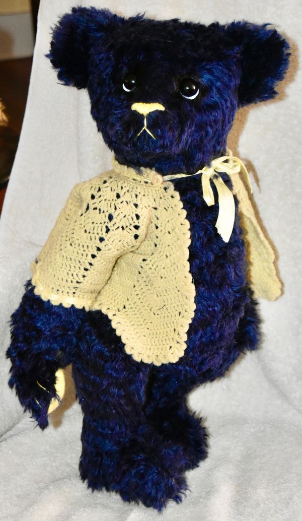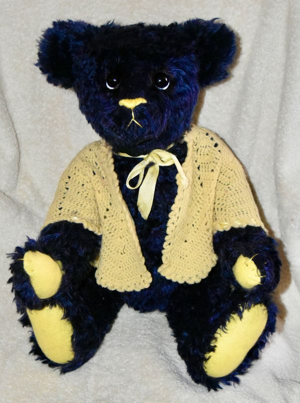 Midnight Sun is a big 20" Dark blue mohair OOAK hand stitched bear who gives great hugs! He has yellow felt paw pads, a yellow stitched nose, mouth and claws, Purple glass eyes and a leather collar. He comes with a yellow Sweater.
